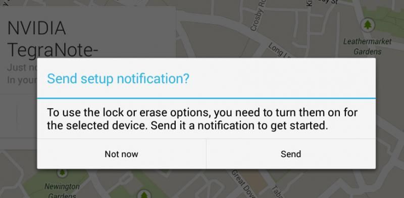 Selecting Setup Lock and Erase will return a dialog box telling you that you need to send the device a notification. Tap Send and you’ll see a message appear in your notification bar for Android Device Manager, tap this.